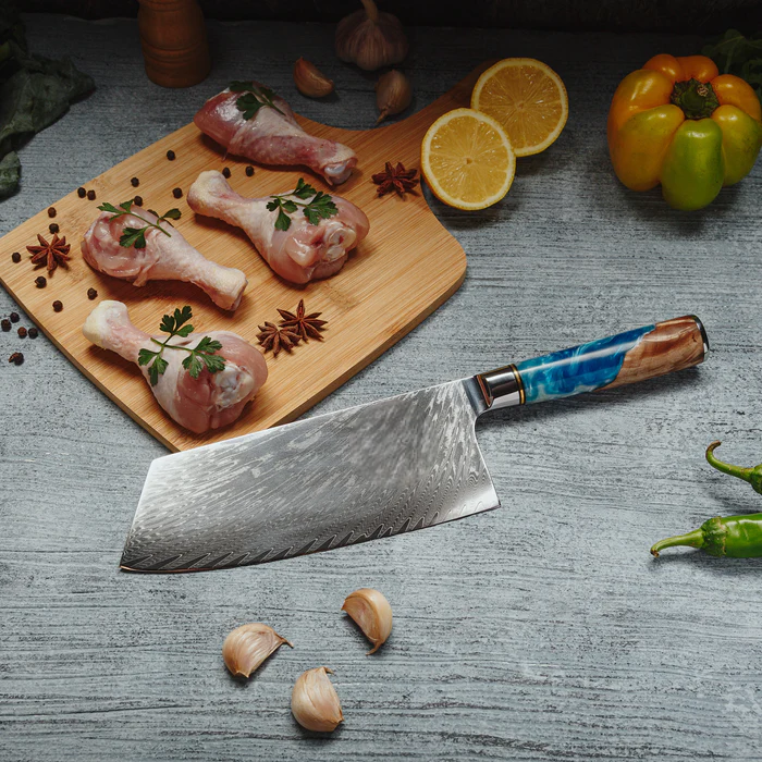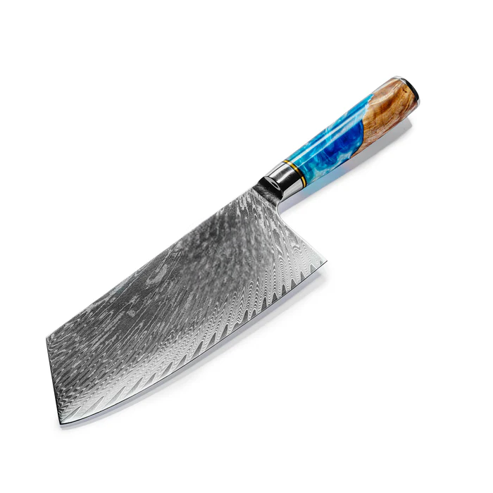 - Lame : acier Damas (67 couches), profil hachoir large